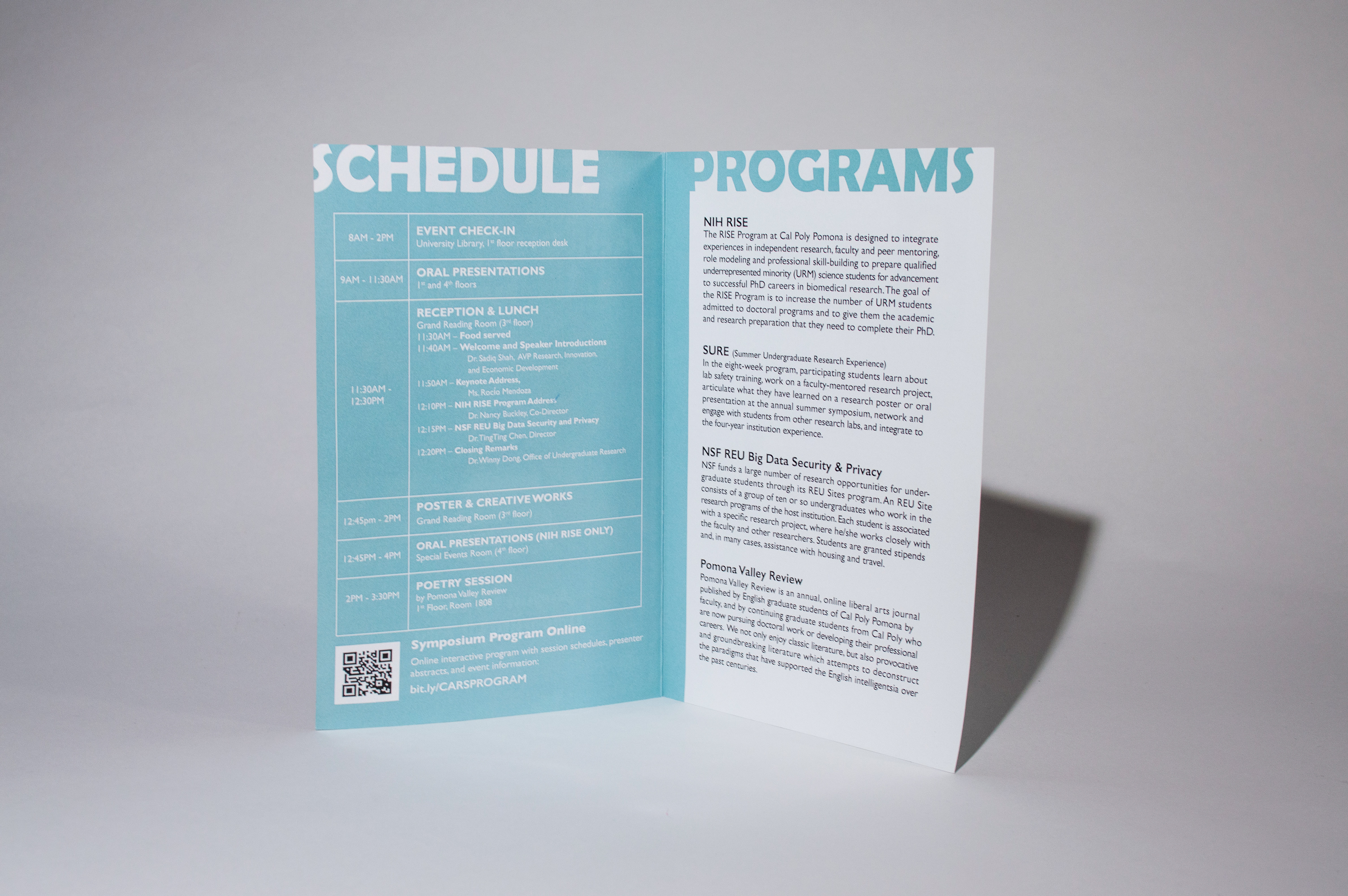 Print and digital design for 4th Annual Creative Activities & Research Symposium held at California State Polytechnic University, Pomona.