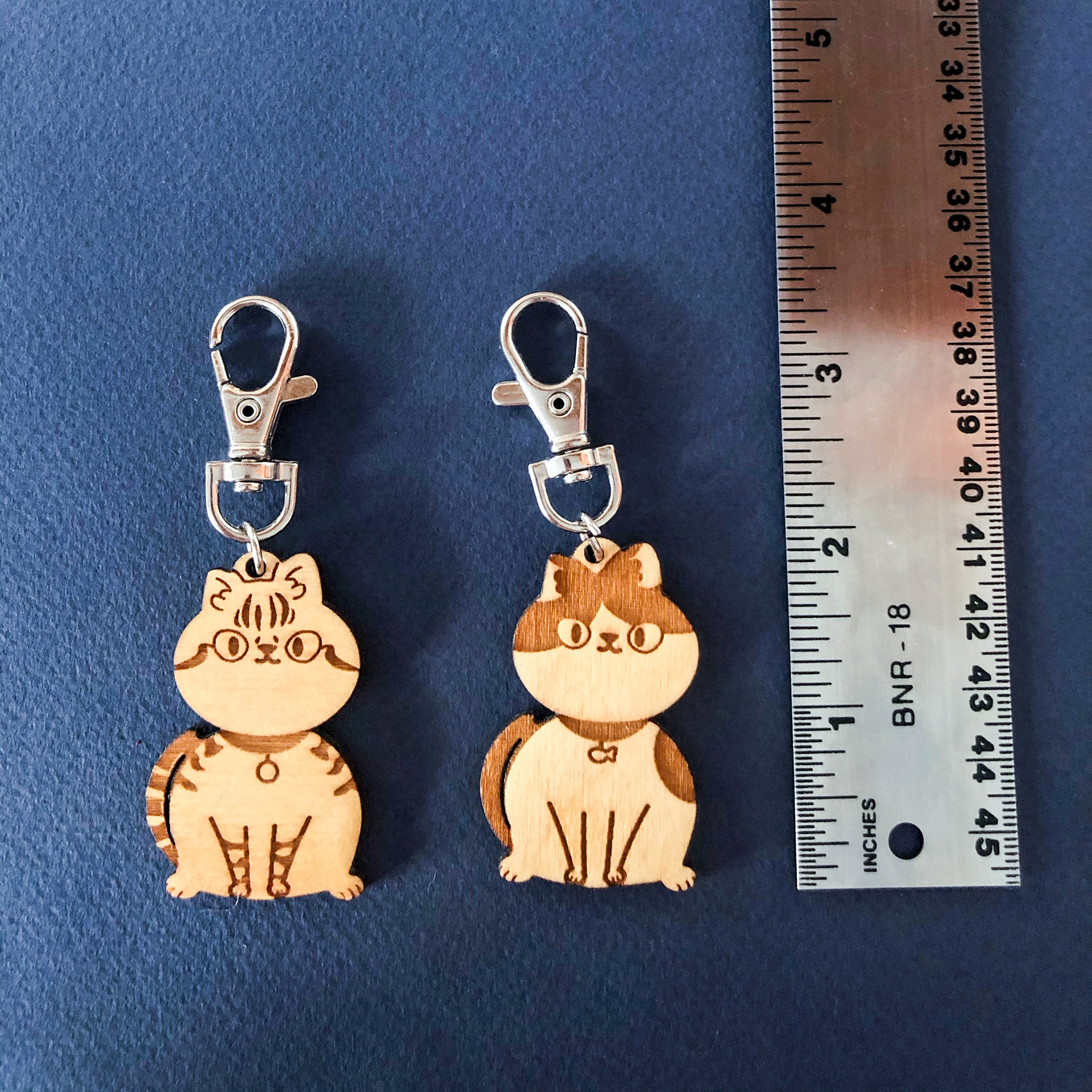 Laser-cut and etched cat keychains. Each keychain was then sanded by hand and coated with protective water-resistant finish.