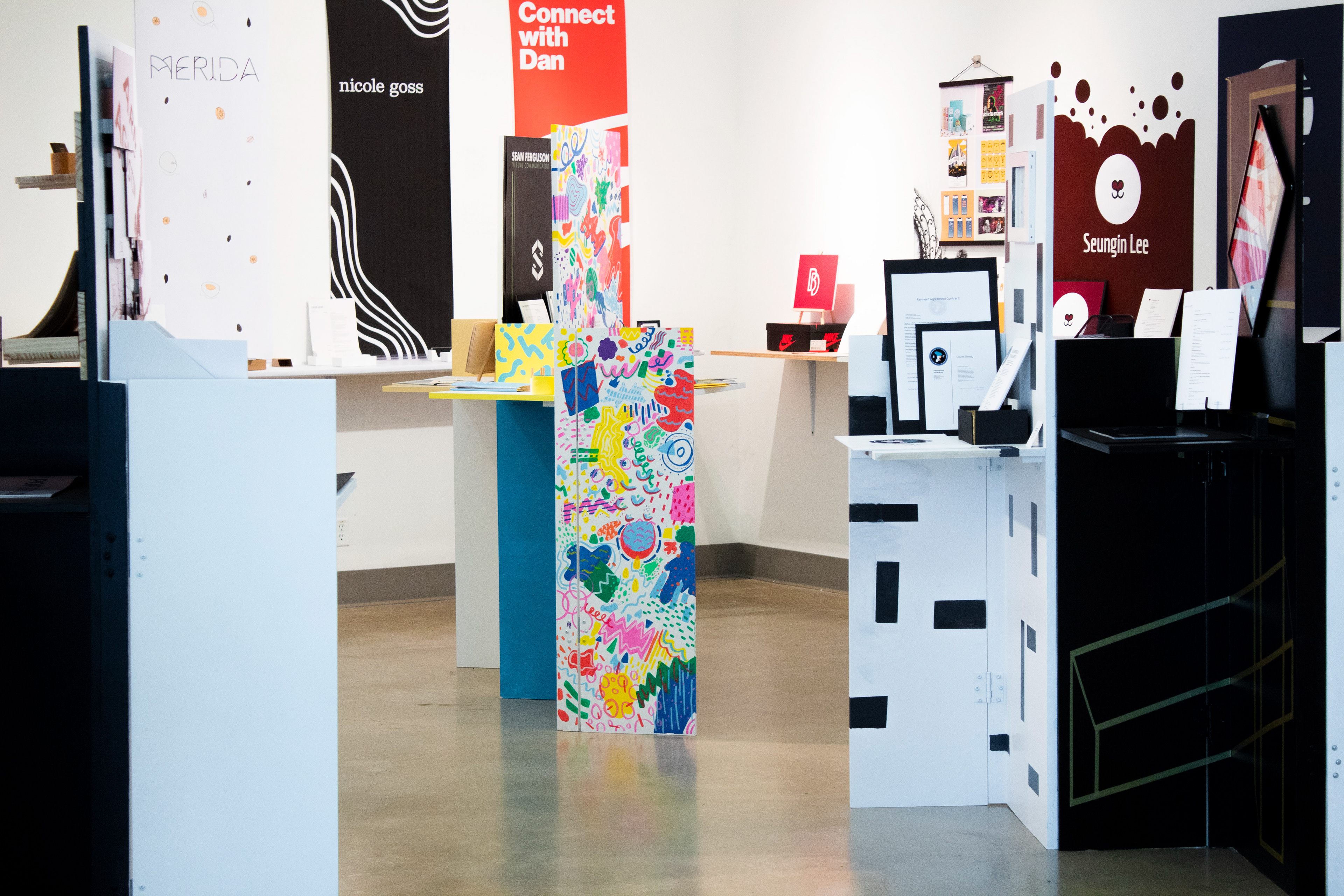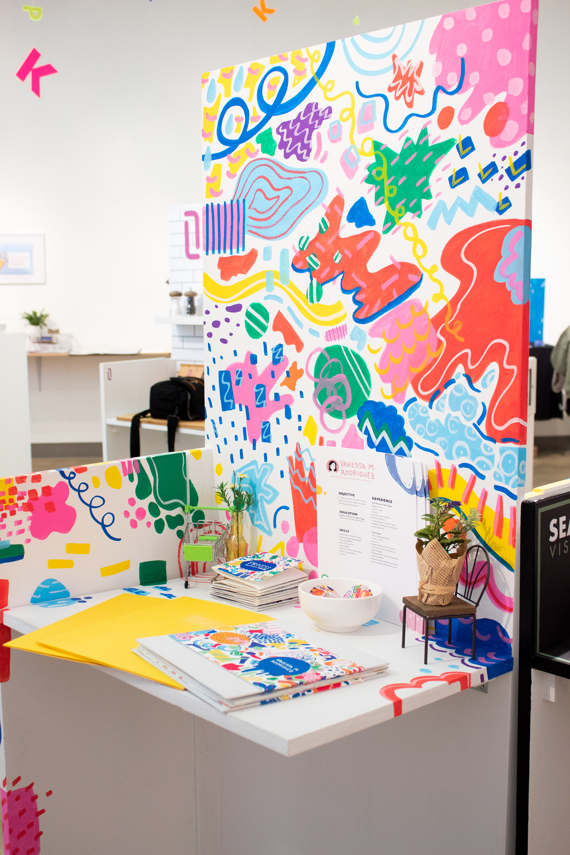 Hand-painted 6ft tall display based on portfolio design aspects, showcased at the W. Keith & Janet Kellogg Art Gallery.